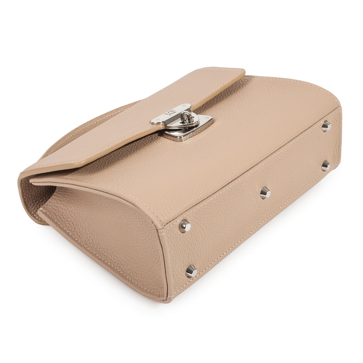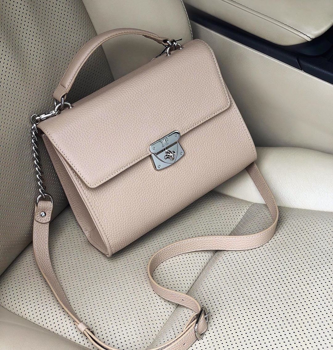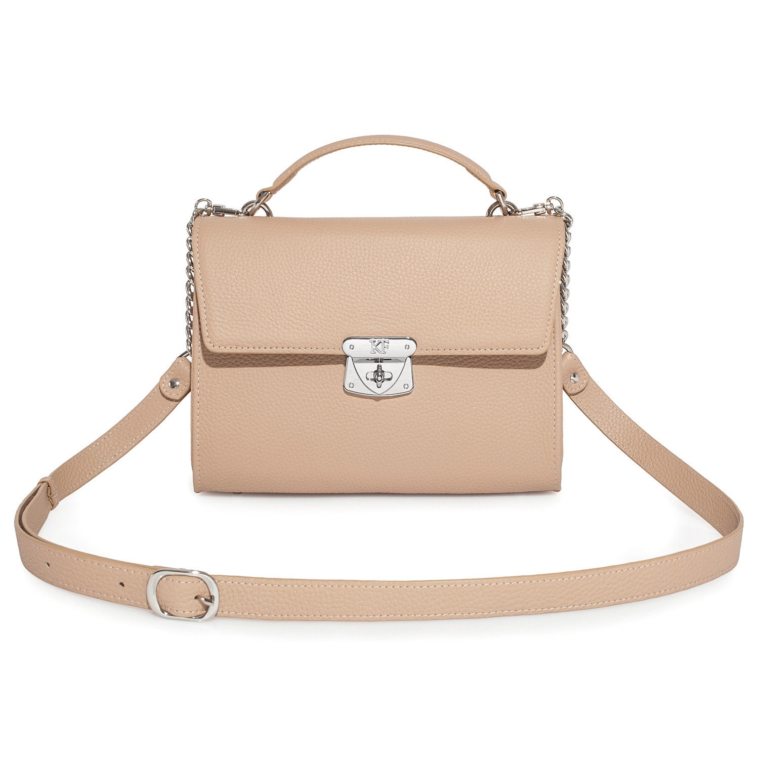 Beige genuine leather handbag from ukrainian designer Katerina Fox. The internal space of a bag is equipped with three spacious compartments and two patch-pockets and one zipper pocket. One of the spacious compartments is closed with a zipper. The bag is closed with a clasp. The bottom of the bag is protected with metal legs. There is a long handle that allows you to wear the bag on the shoulder. The kit also includes a storage bag.