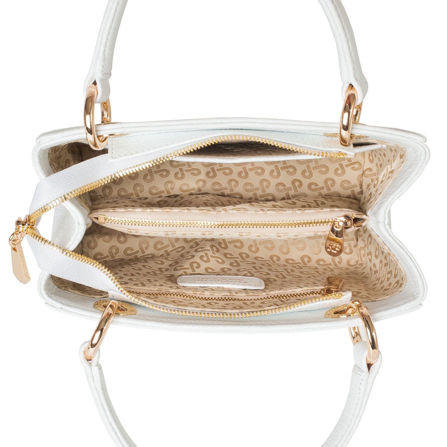 Delivery: In most cases our goods are shipped by FedEx or Ups Express. On rare occasions the goods might be shipped by Ukrposhta. The clients should check in advance an estimate of the amount of customs duty and value added tax.White genuine leather handbag from ukrainian designer Katerina Fox. This model is designed for women who appreciate the sleek design combined with functionality and comfort. Despite the simplicity, this bag stands out thanks to a triangular insert in black suede leather. High-quality and reliable hardware ensure long service bags. Inside the bag are three spacious compartments, one with zip, two patch pockets and one zippered pocket closes with a zipper. The bottom of the bag protected by metal feet.