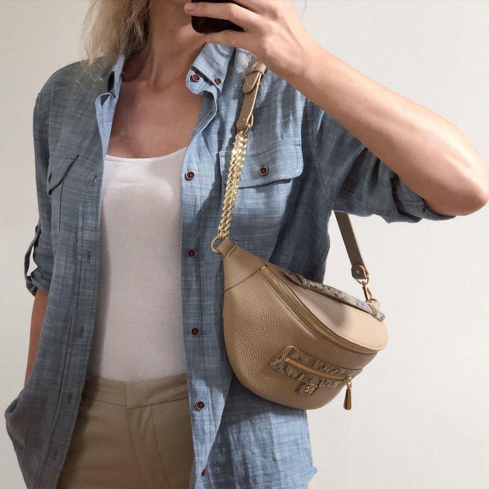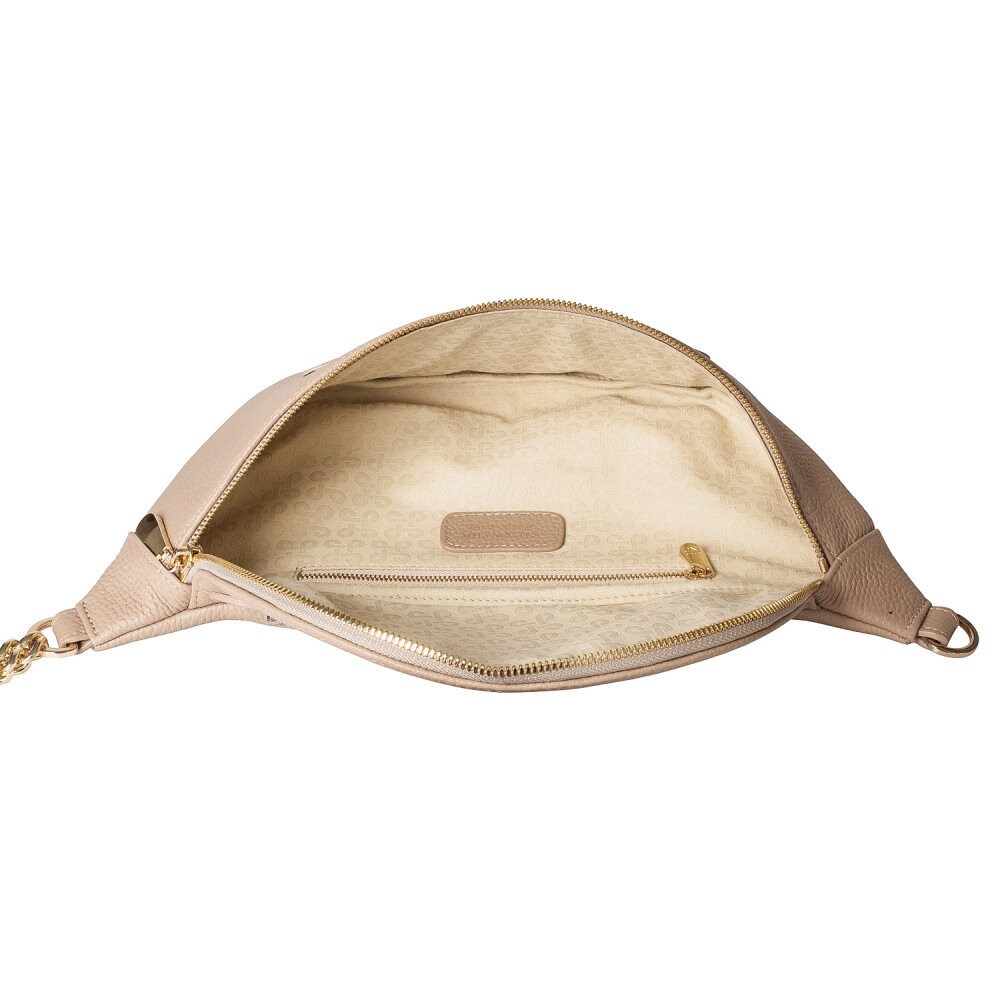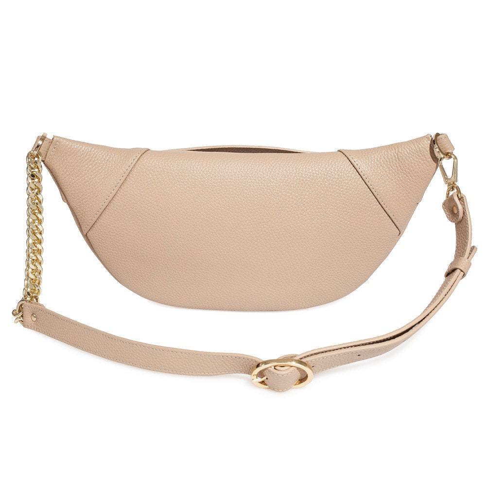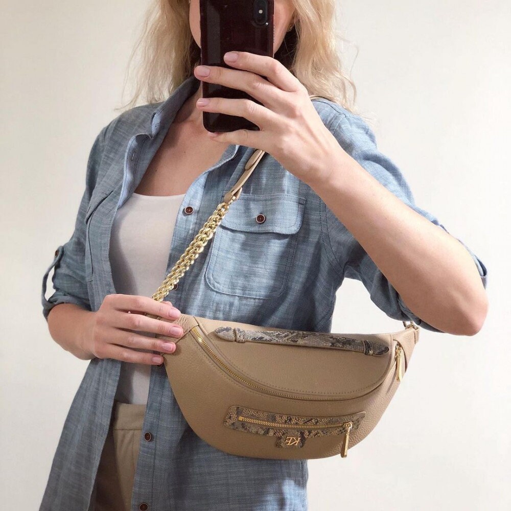 Bleige genuine leather woman banana bag from Ukrainian designer Katerina Fox. Fashionable and elegant modern bag KF for bright girls and women. This bag is able to attract attention and highlight your exquisite taste. Inside the bag is one large compartment and a convenient zippered pocket for small items that closes the bag on the zipper.